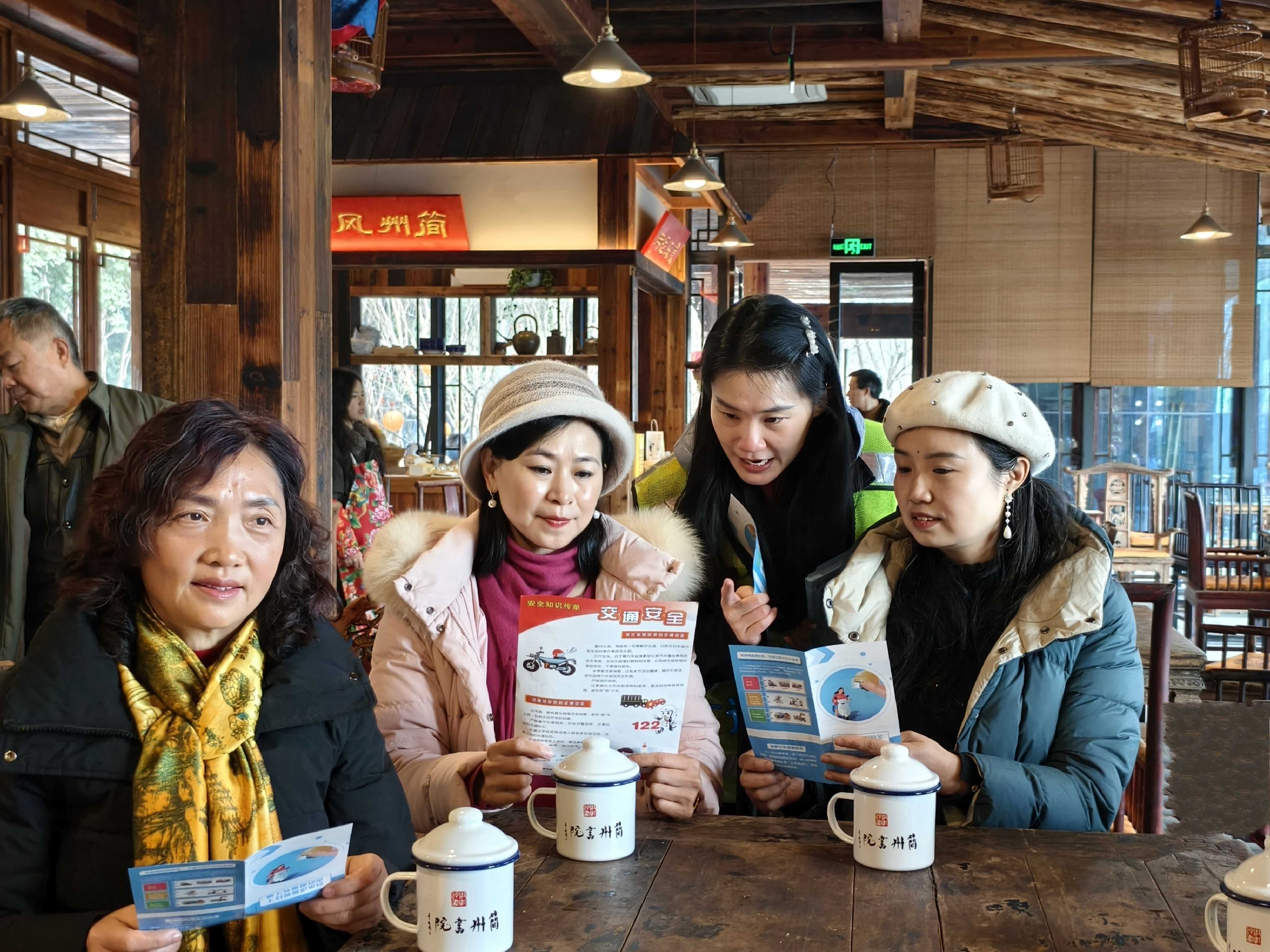 活动当天,简州书院古色古香的庭院里人头攒动。工作人员早早布置好宣传展台,摆满了“一盔一带”安全守护、酒后驾驶危害、大货车盲区警示等主题宣传海报和折页。刚走进书院,市民就被浓郁的粥香和热闹的氛围吸引,纷纷驻足咨询。